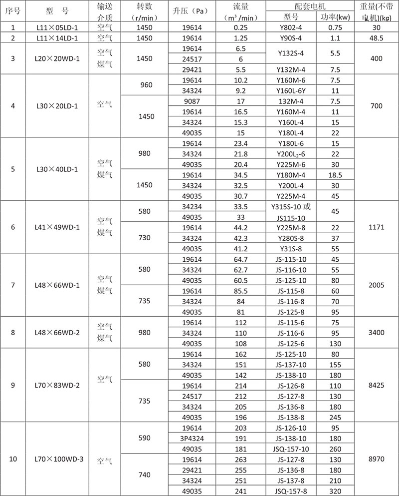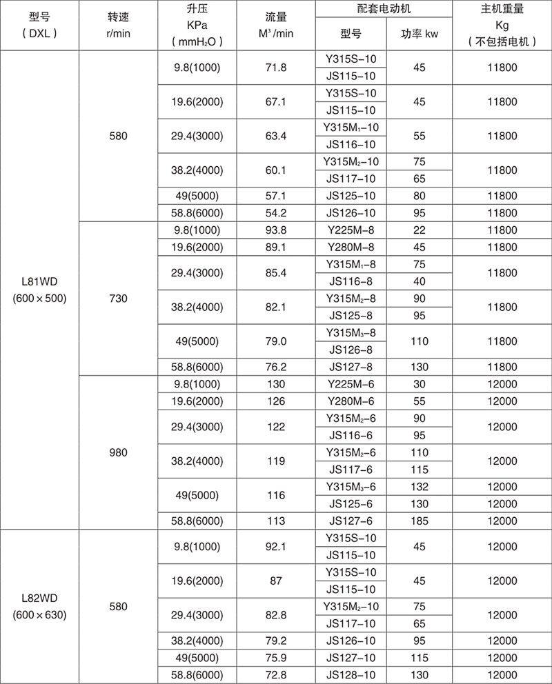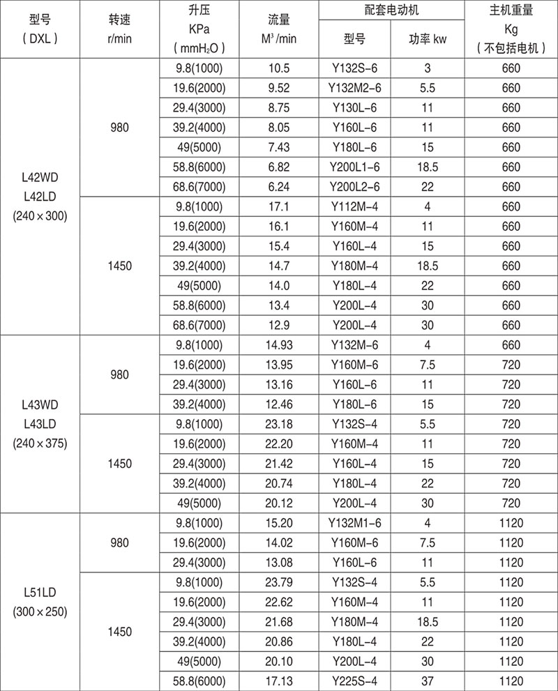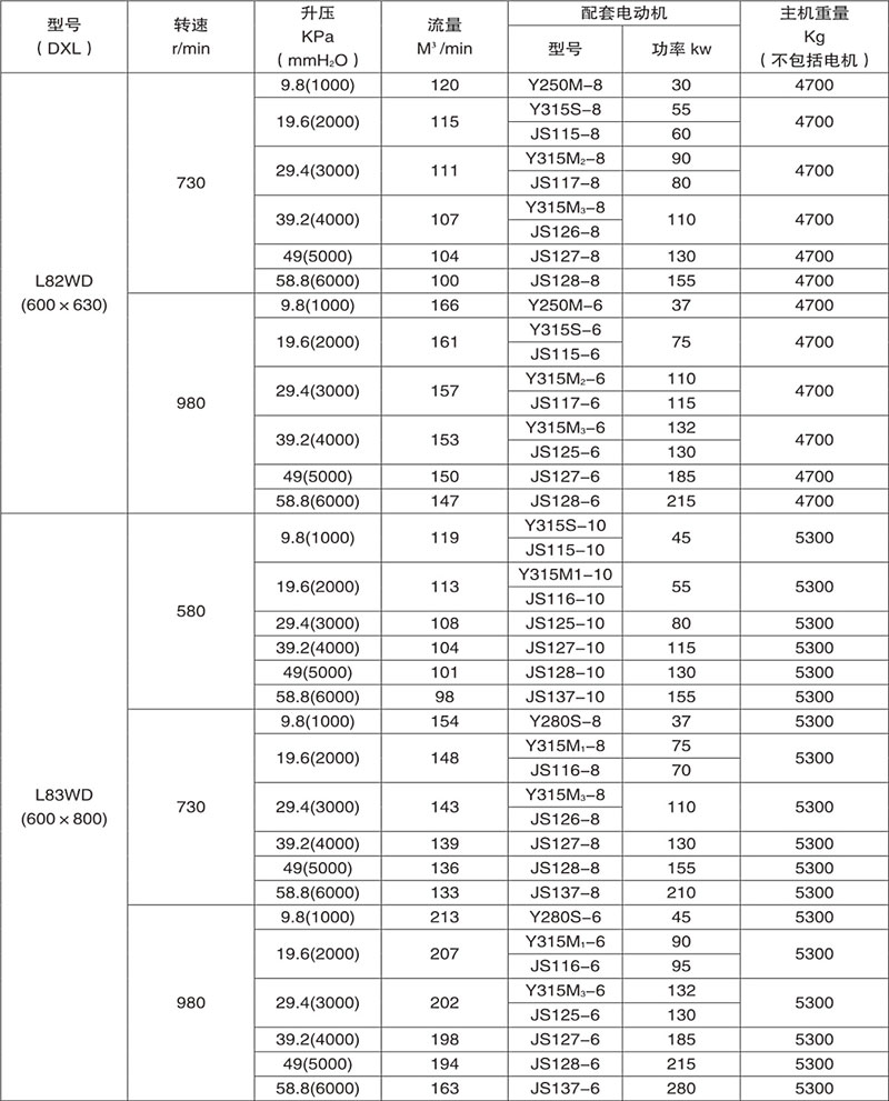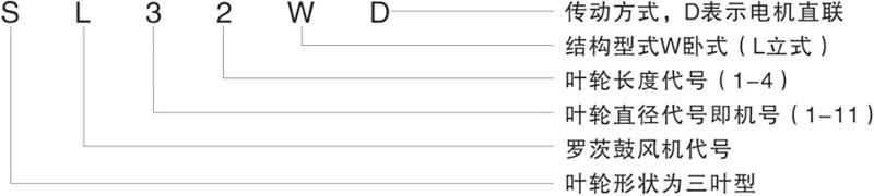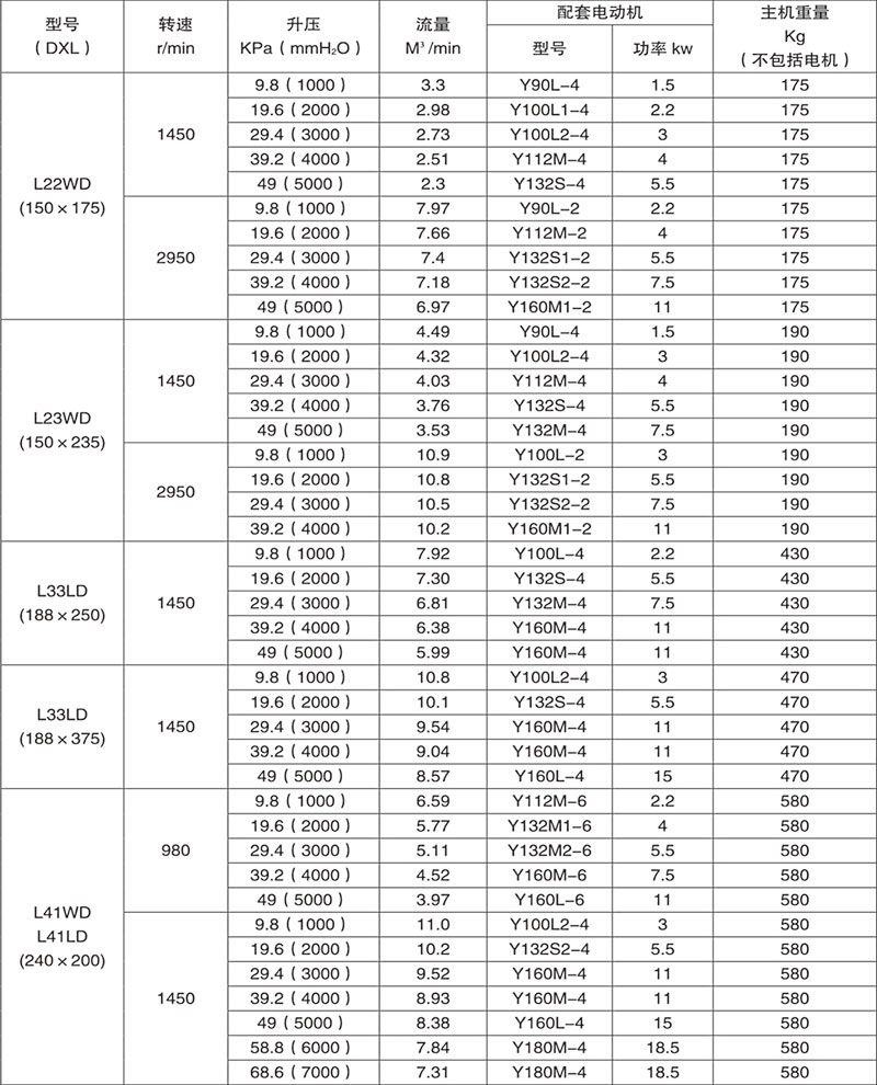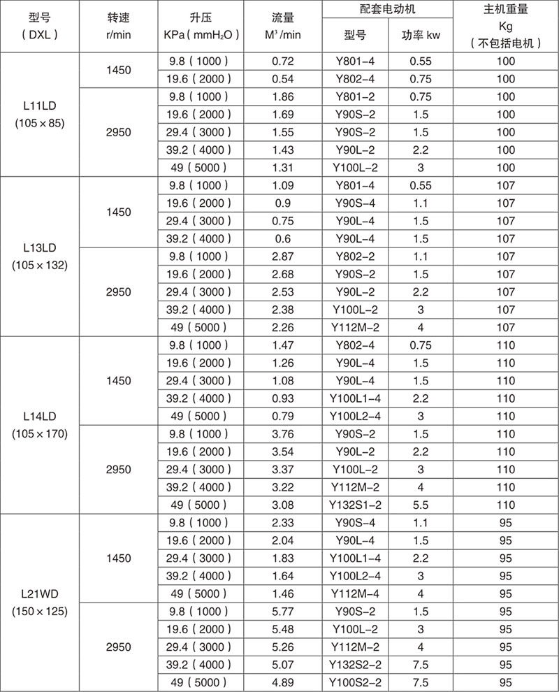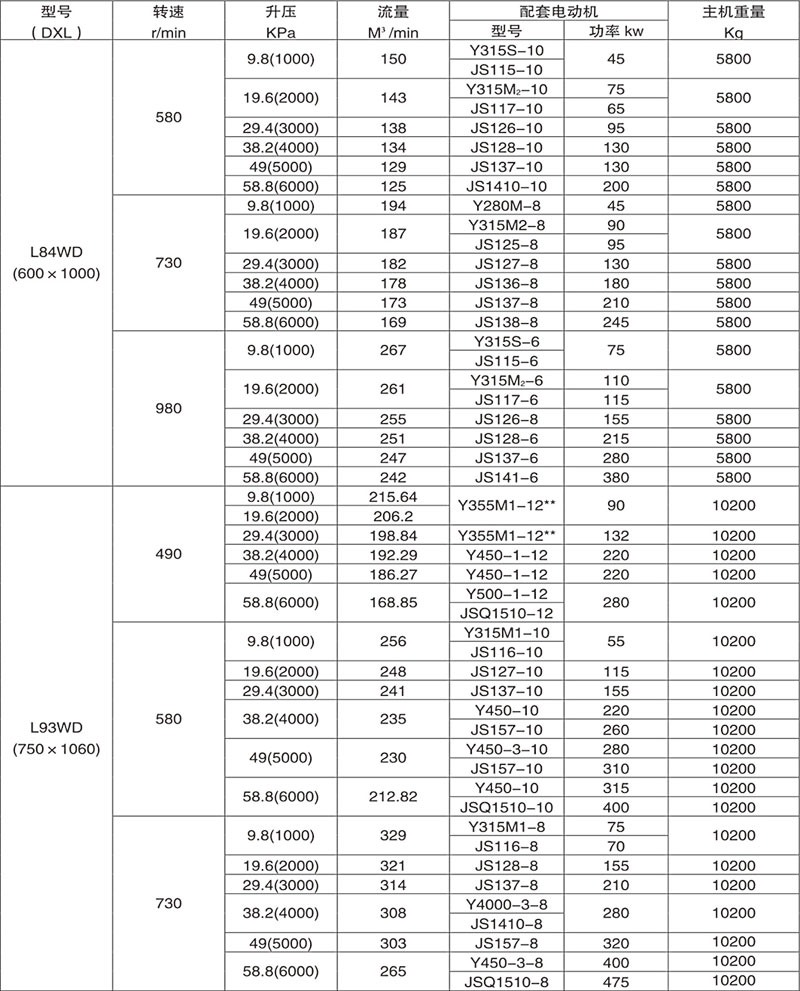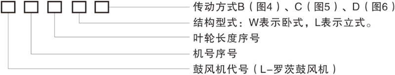 例:L84WD表示第8號機型(葉輪直徑為600mm,兩轉子中心距400mm),第4號葉輪長度)(1000mm),臥式、聯軸器直聯傳動。