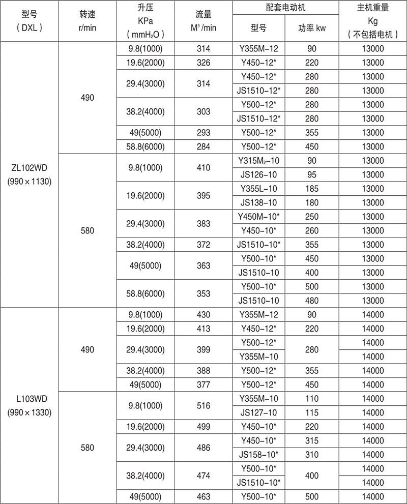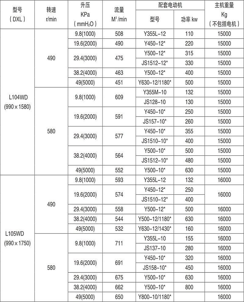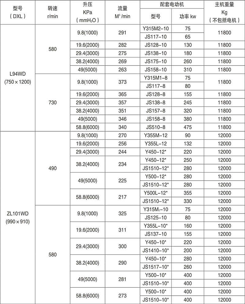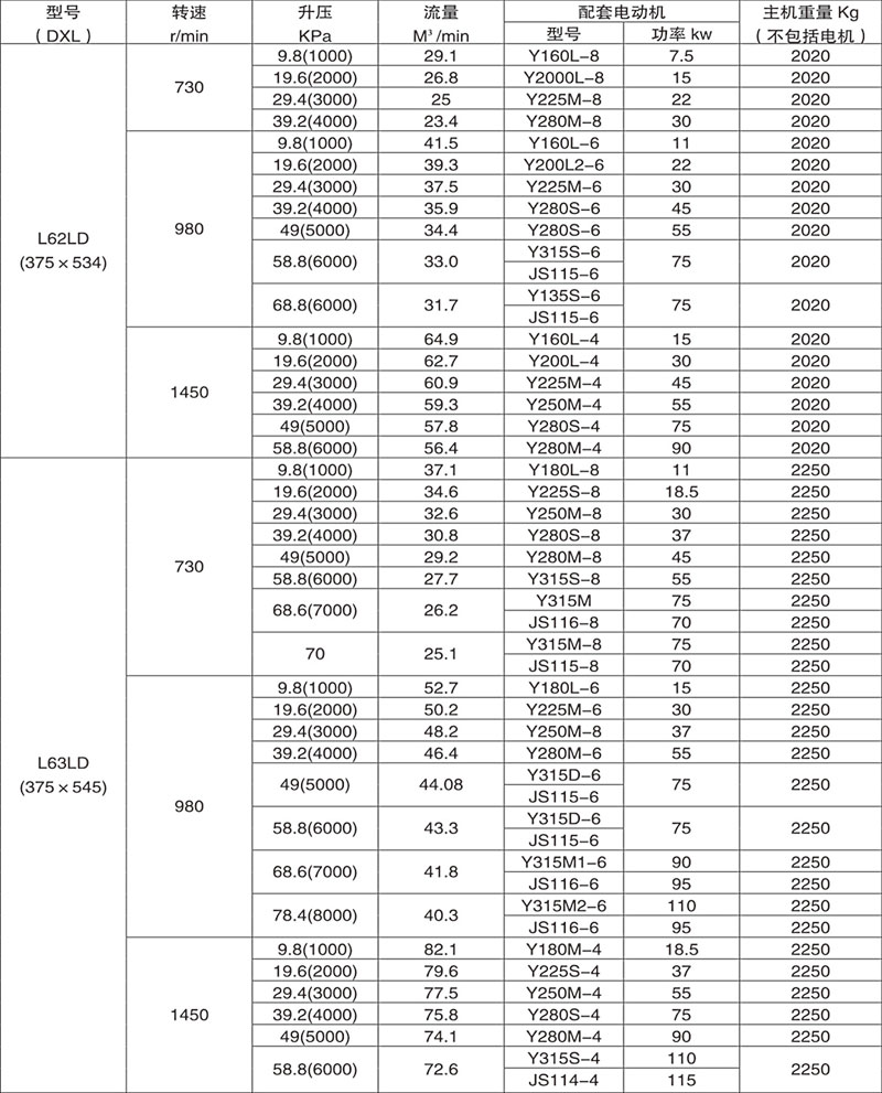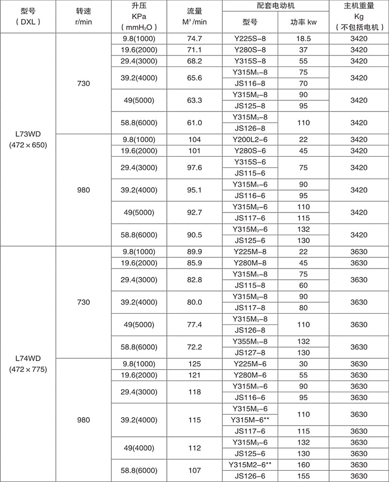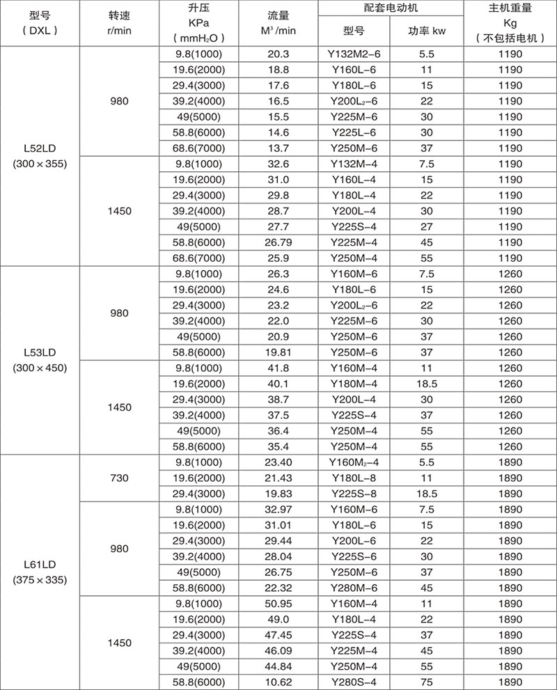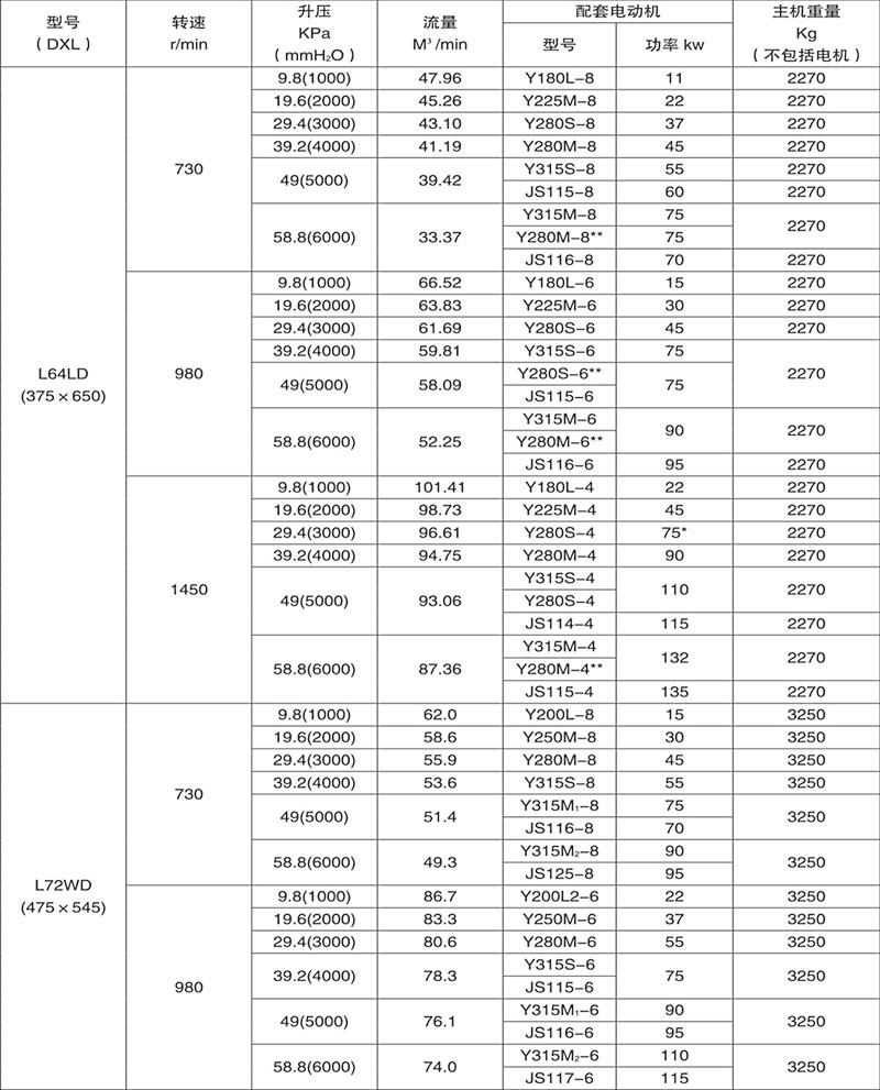 例:L84WD表示第8號機型(葉輪直徑為600mm,兩轉子中心距400mm),第4號葉輪長度)(1000mm),臥式、聯軸器直聯傳動。
